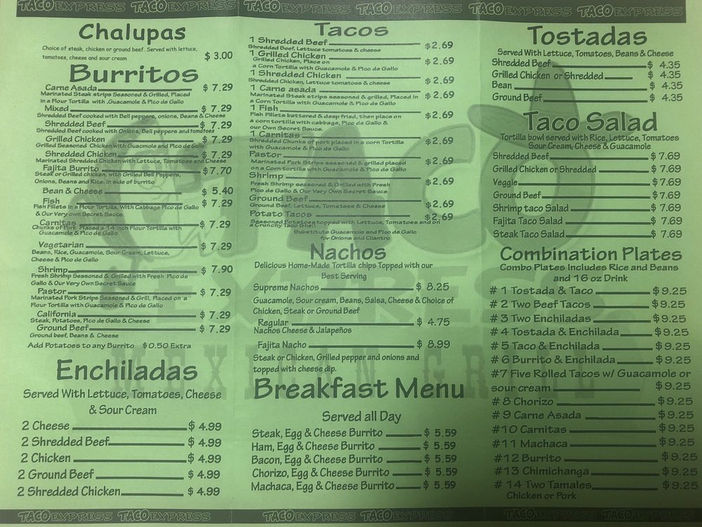 In addition to delectable food, Taco Express offers free parking, accepts credit cards and Apple Pay, and features a TV for your entertainment. Casual, classy, and kid-friendly, it’s an excellent choice for your next meal!